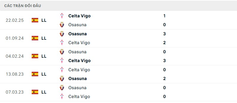 Thành tích đối đầu giữa Osasuna với Celta Vigo